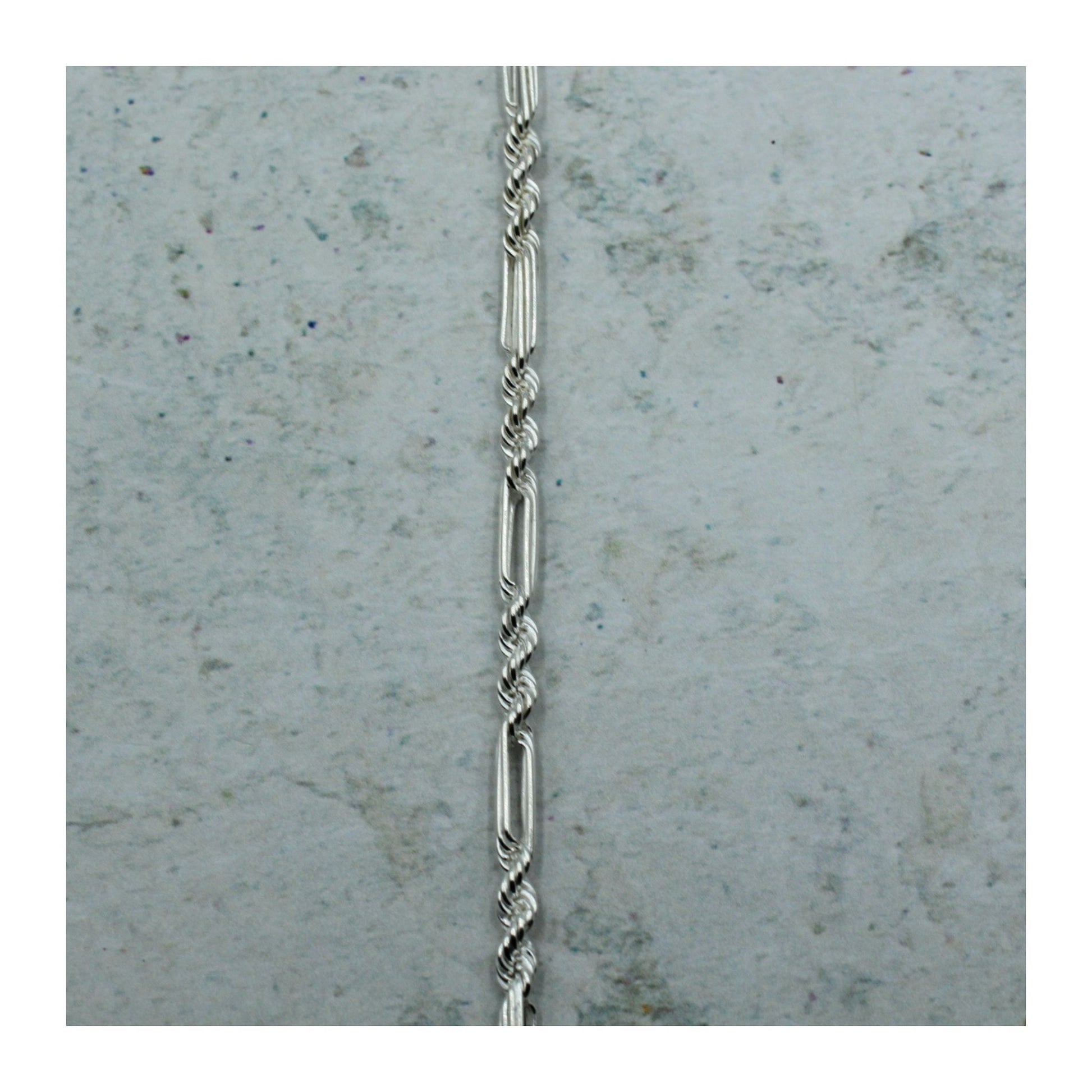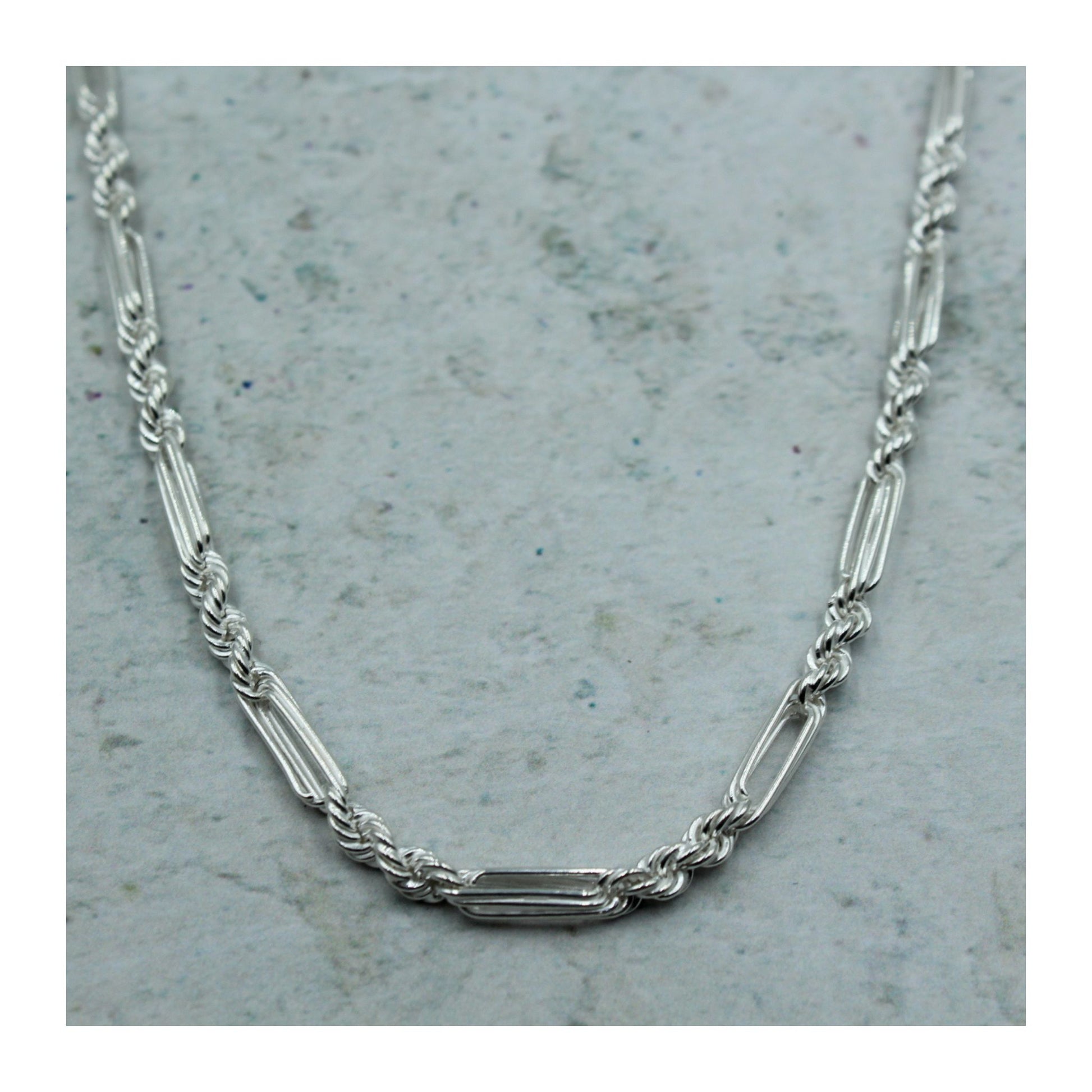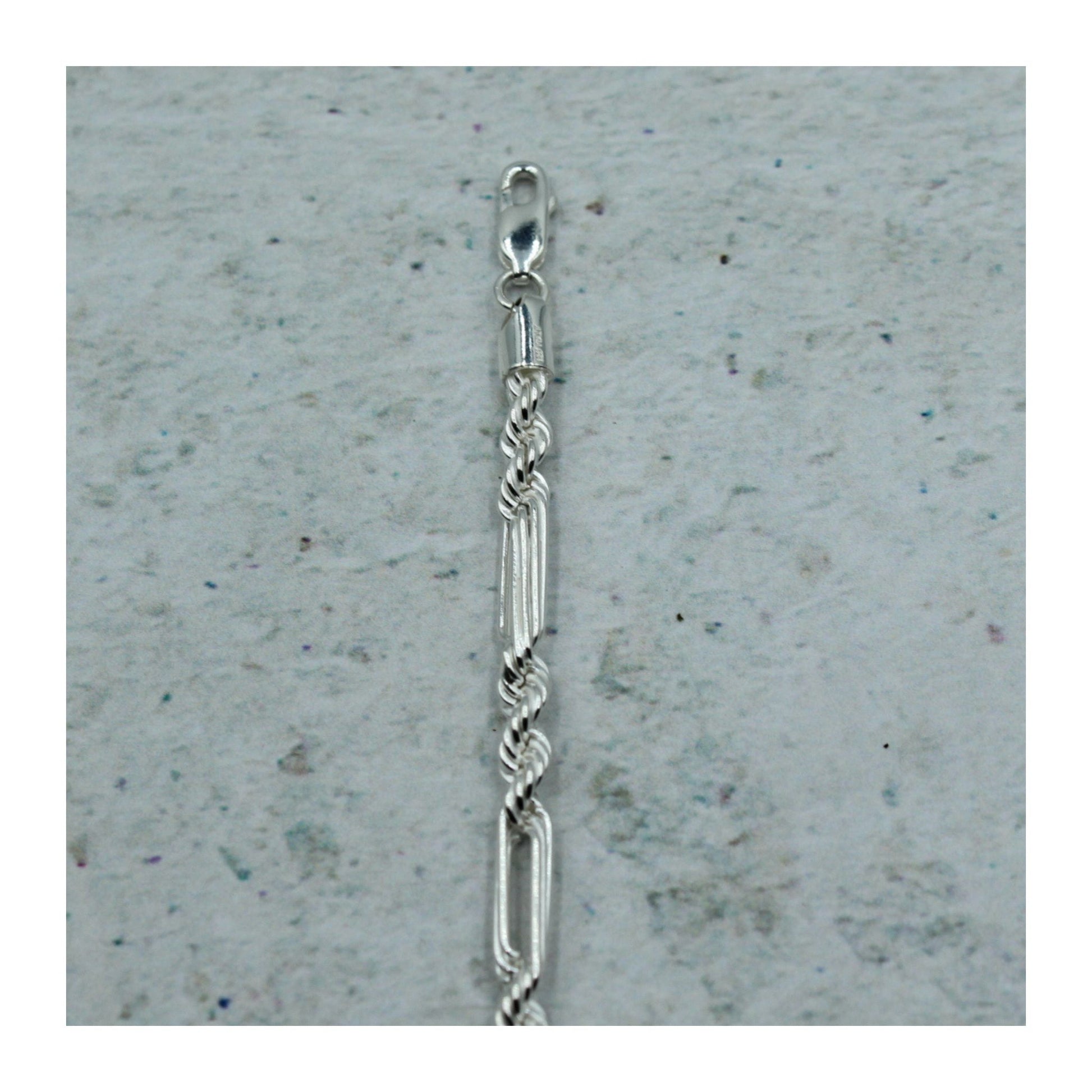 Cadena elaborada en plata .925 auténtica, con un diseño Fígaro de 4 mm que combina eslabones torsales con eslabones alargados, creando un estilo clásico y sofisticado.