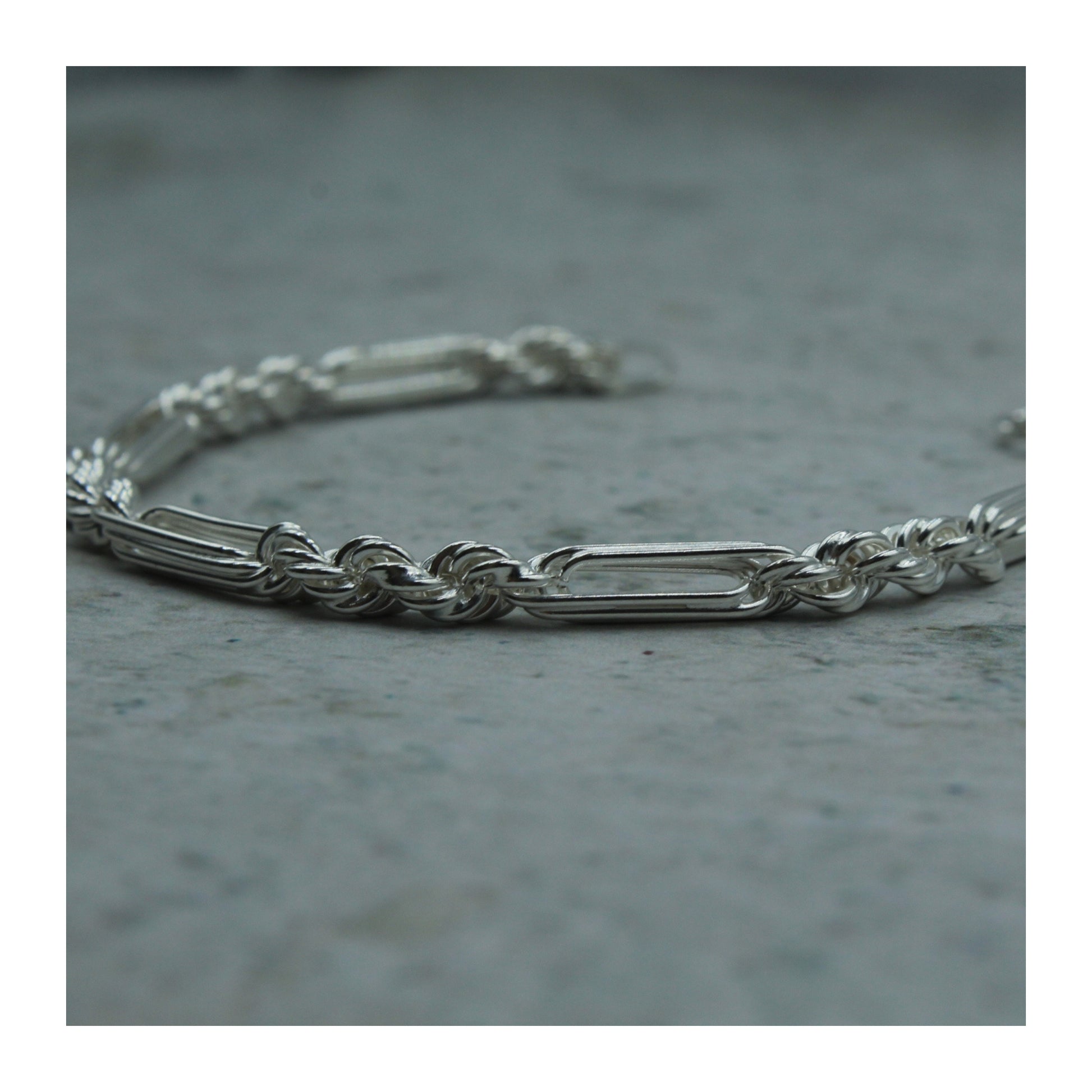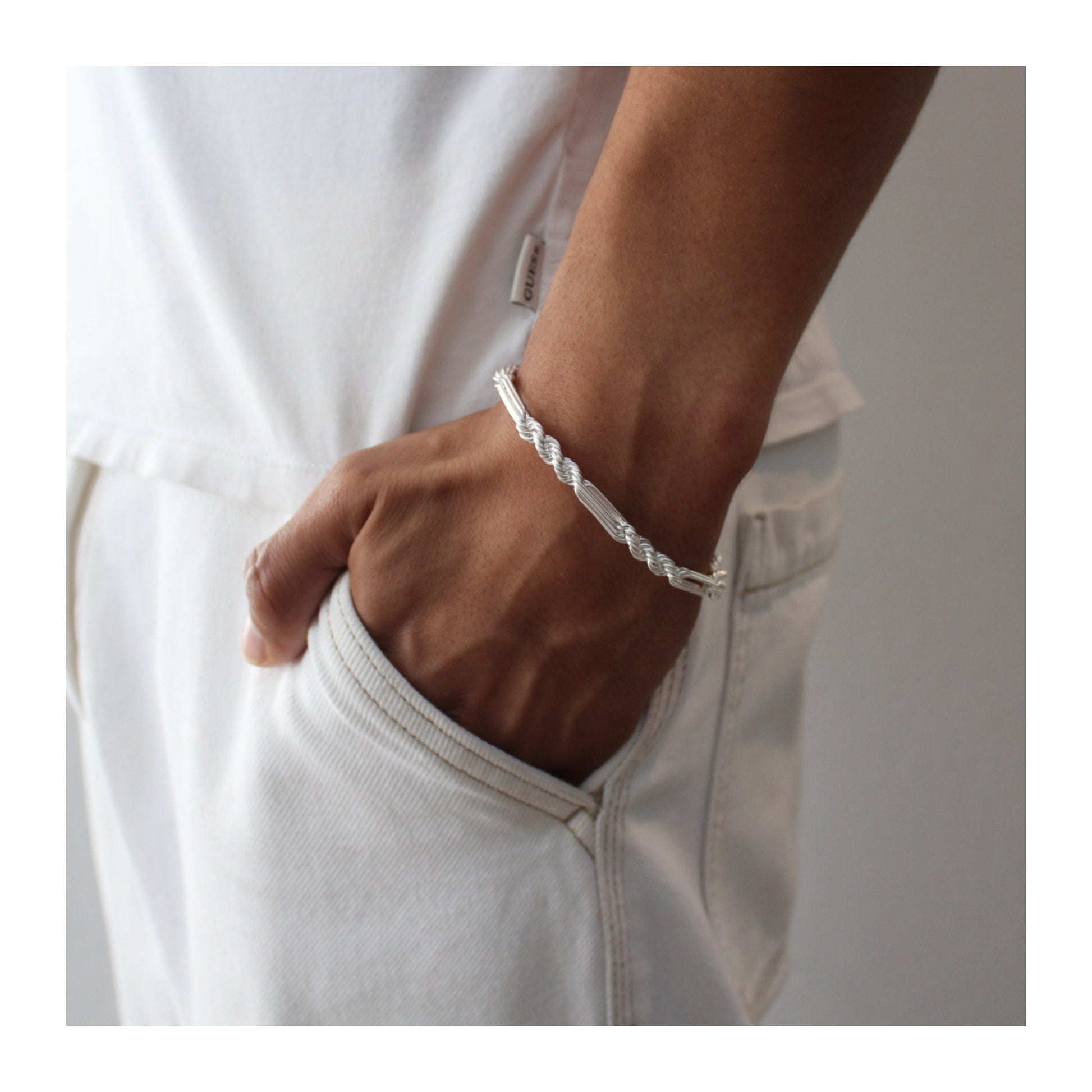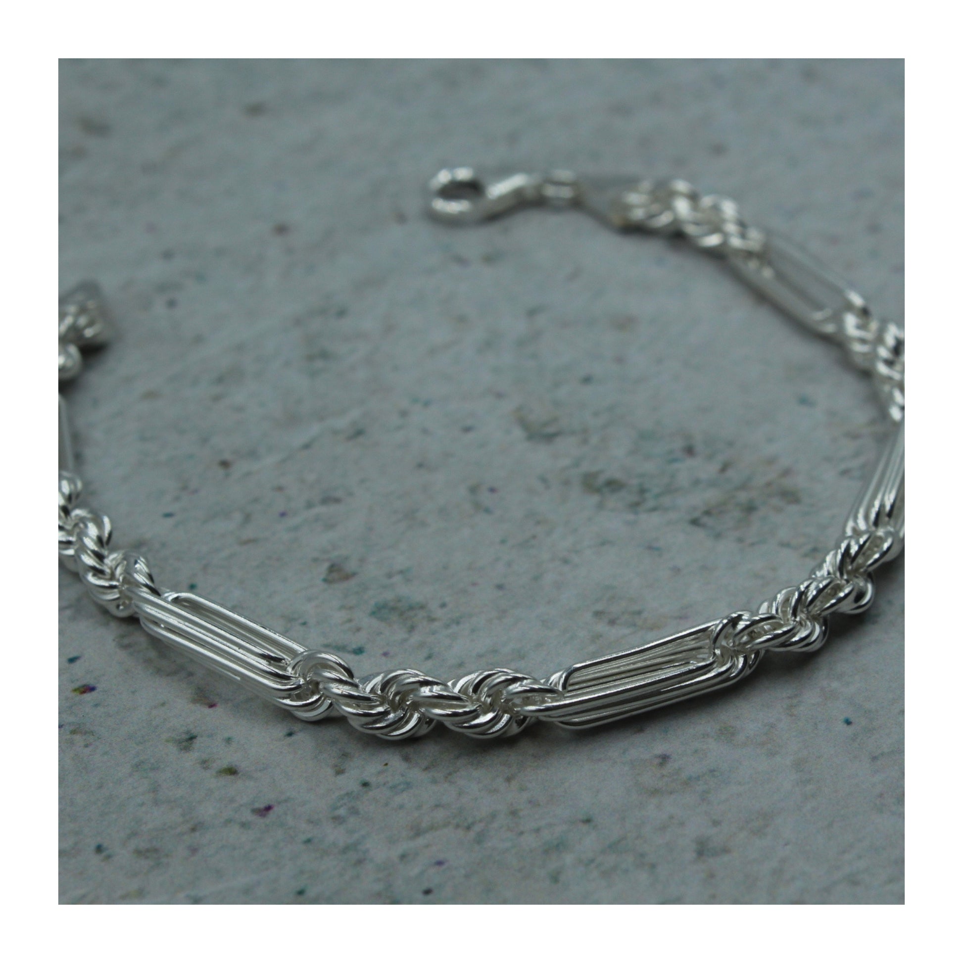 Pulsera elaborada en plata .925 auténtica, con un diseño Fígaro de 5 mm que combina eslabones torsales con eslabones alargados, logrando un estilo fuerte y elegante.