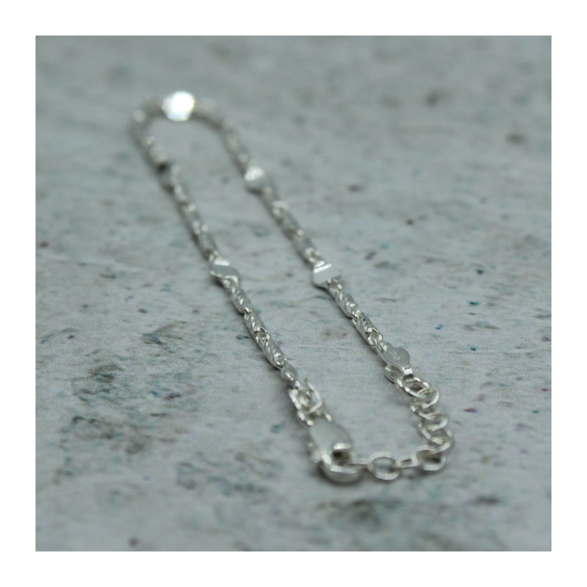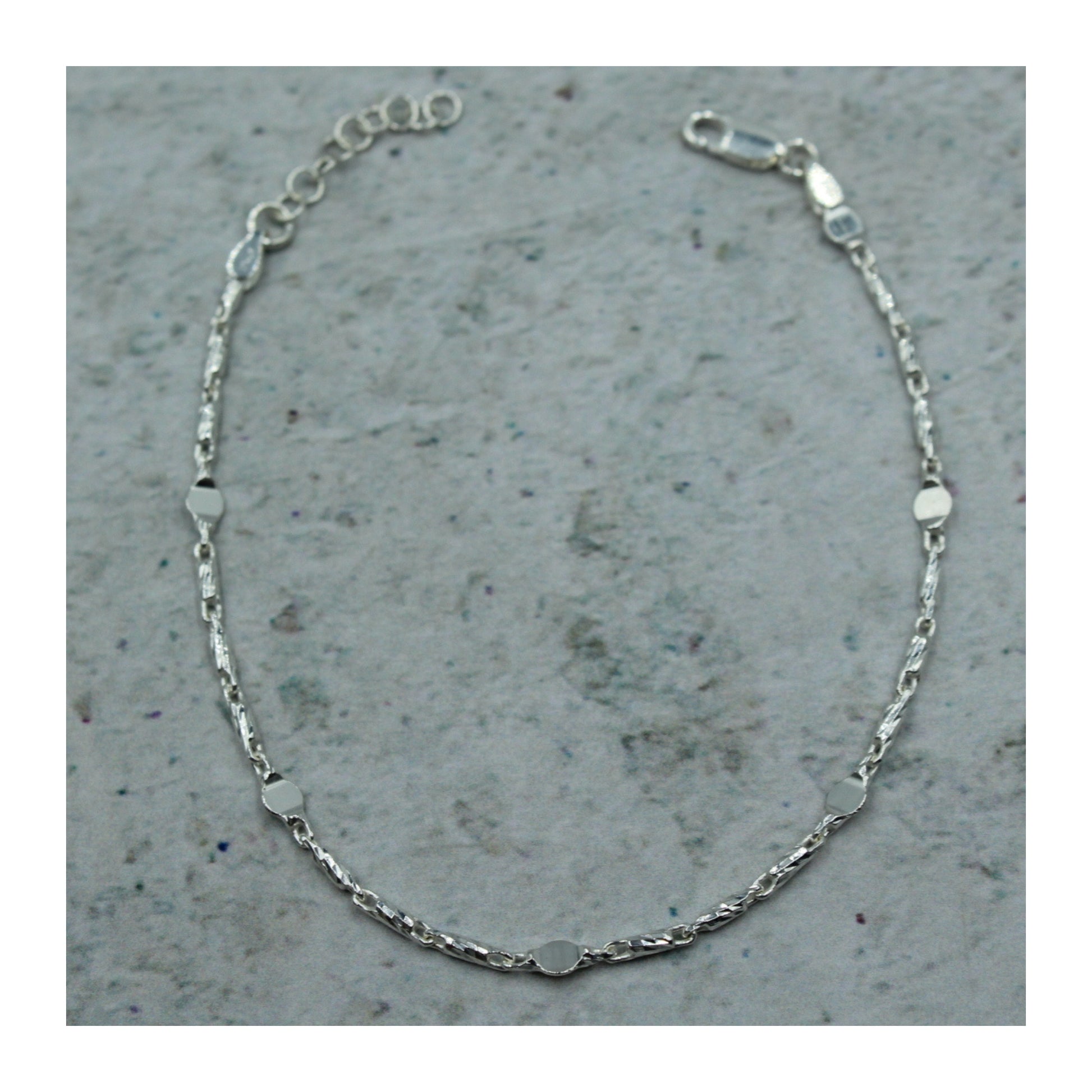 Pulsera elaborada en plata .925 auténtica, con un delicado diseño tubular que intercala pequeñas plaquitas, logrando un contraste elegante y distintivo.
