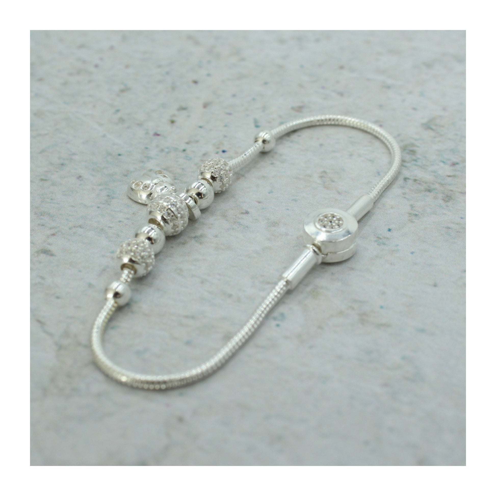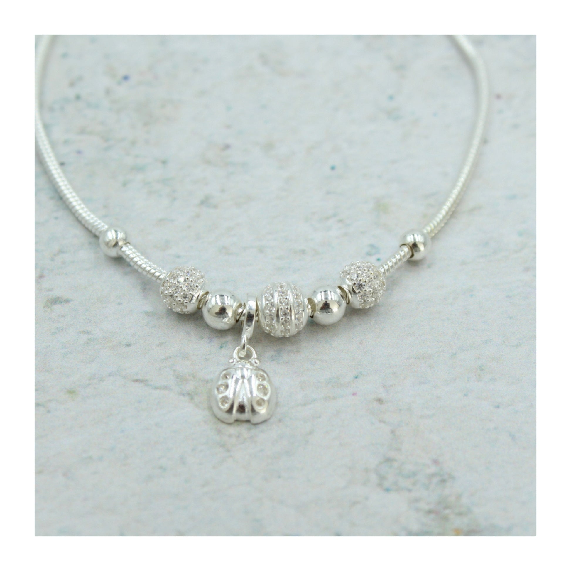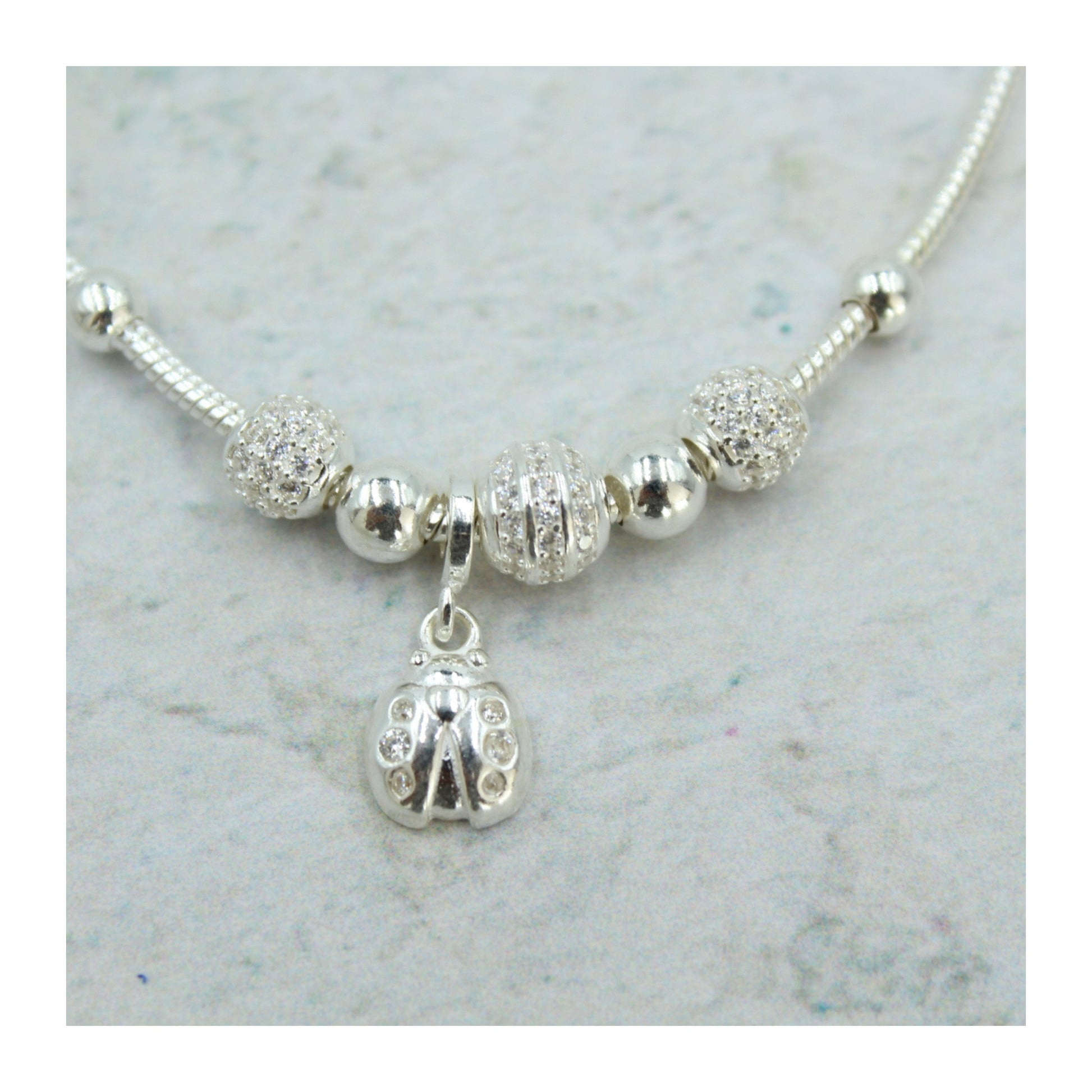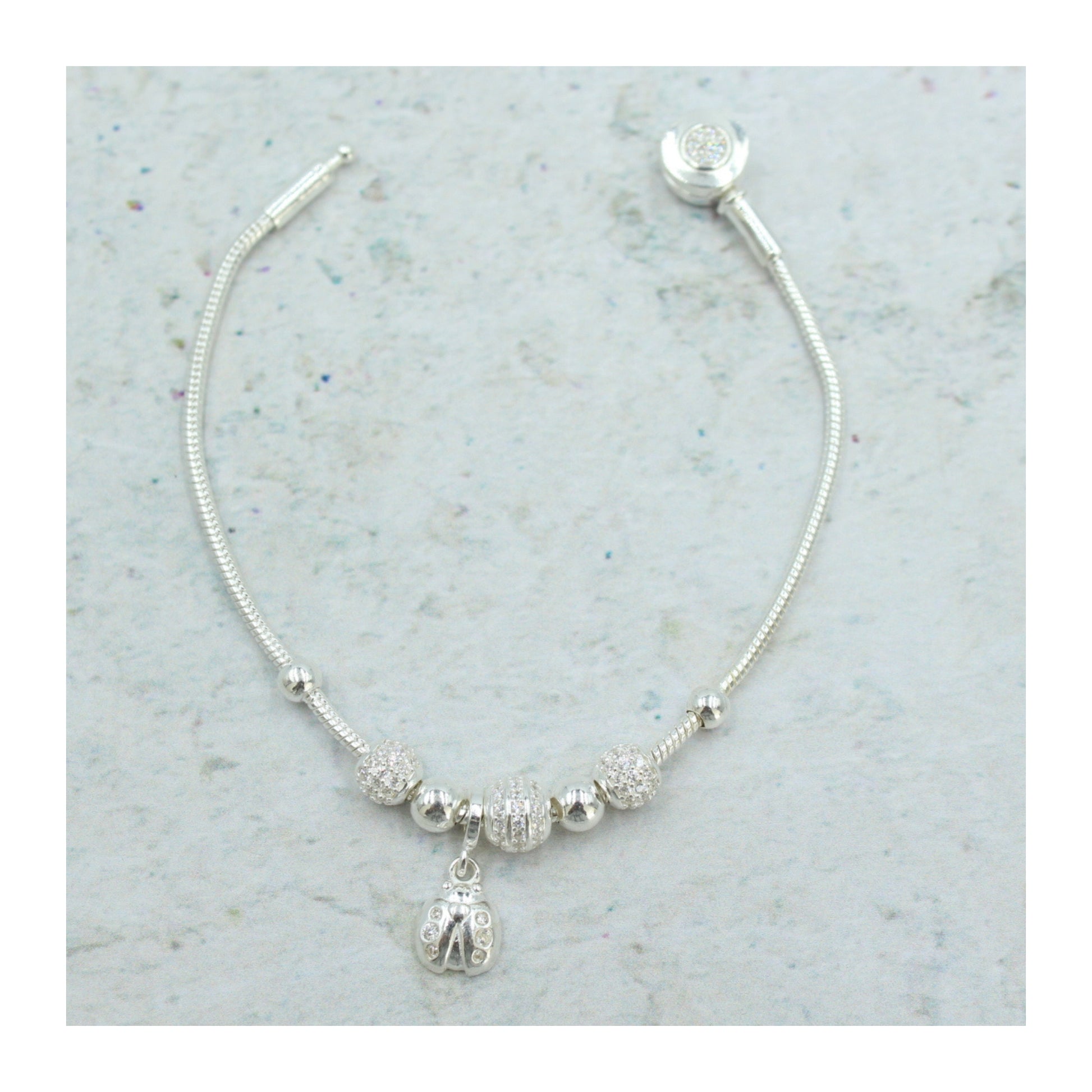 Incluye un dije en forma de catarina con incrustaciones de circonias brillantes, símbolo de buena fortuna y protección. La acompañan tres bolas grandes con circonia, cuatro cuentas esféricas lisas en plata y un broche con detalles de circonia que aportan un acabado sofisticado y elegante. Cada detalle resalta la luminosidad de la plata, convirtiéndola en una joya única y significativa.
