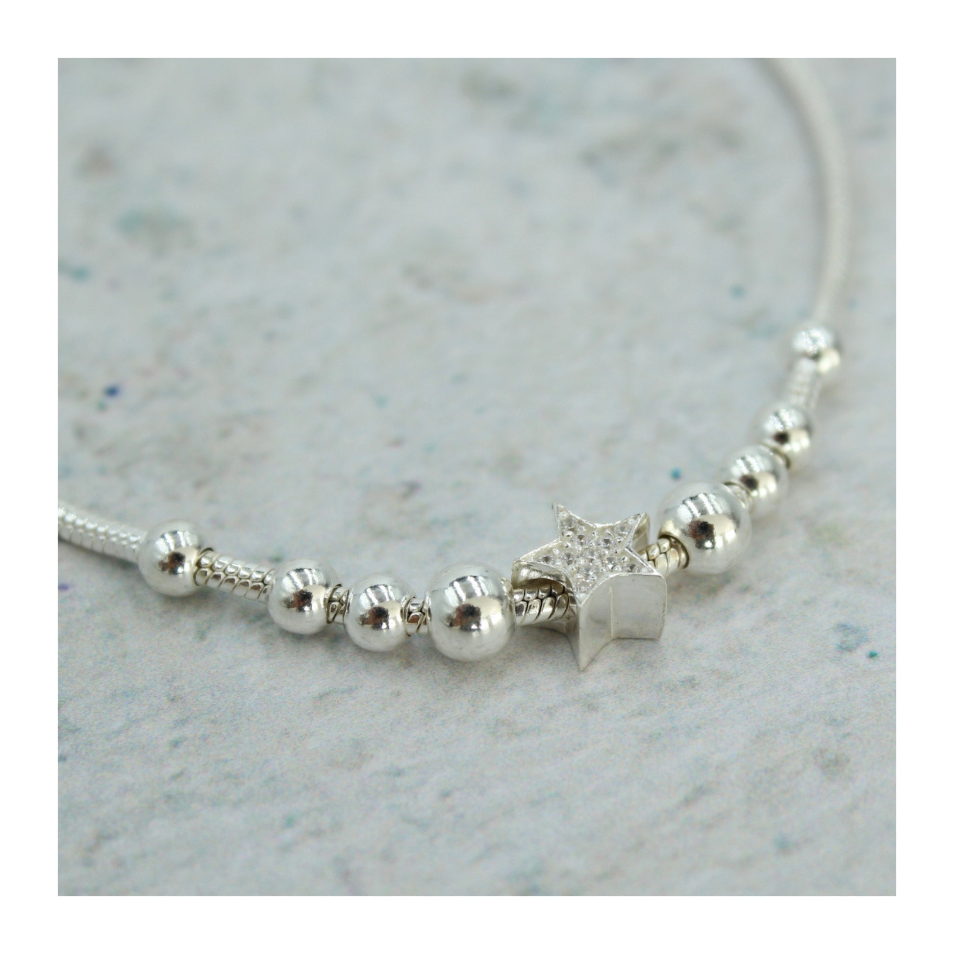 Su dije central es una estrella con incrustaciones de circonia brillante, símbolo de guía y esperanza, acompañada de esferas de plata pulida que realzan su luz.