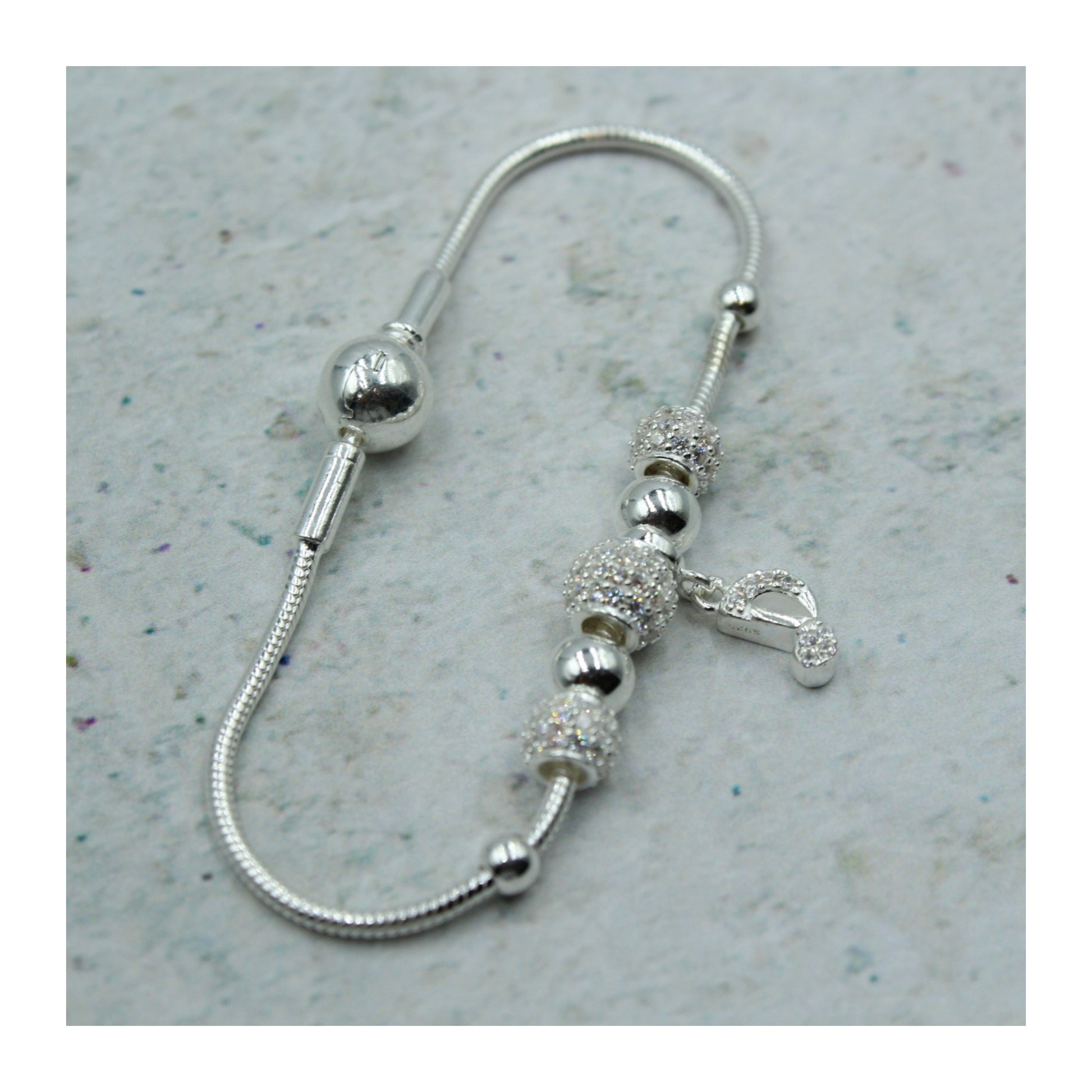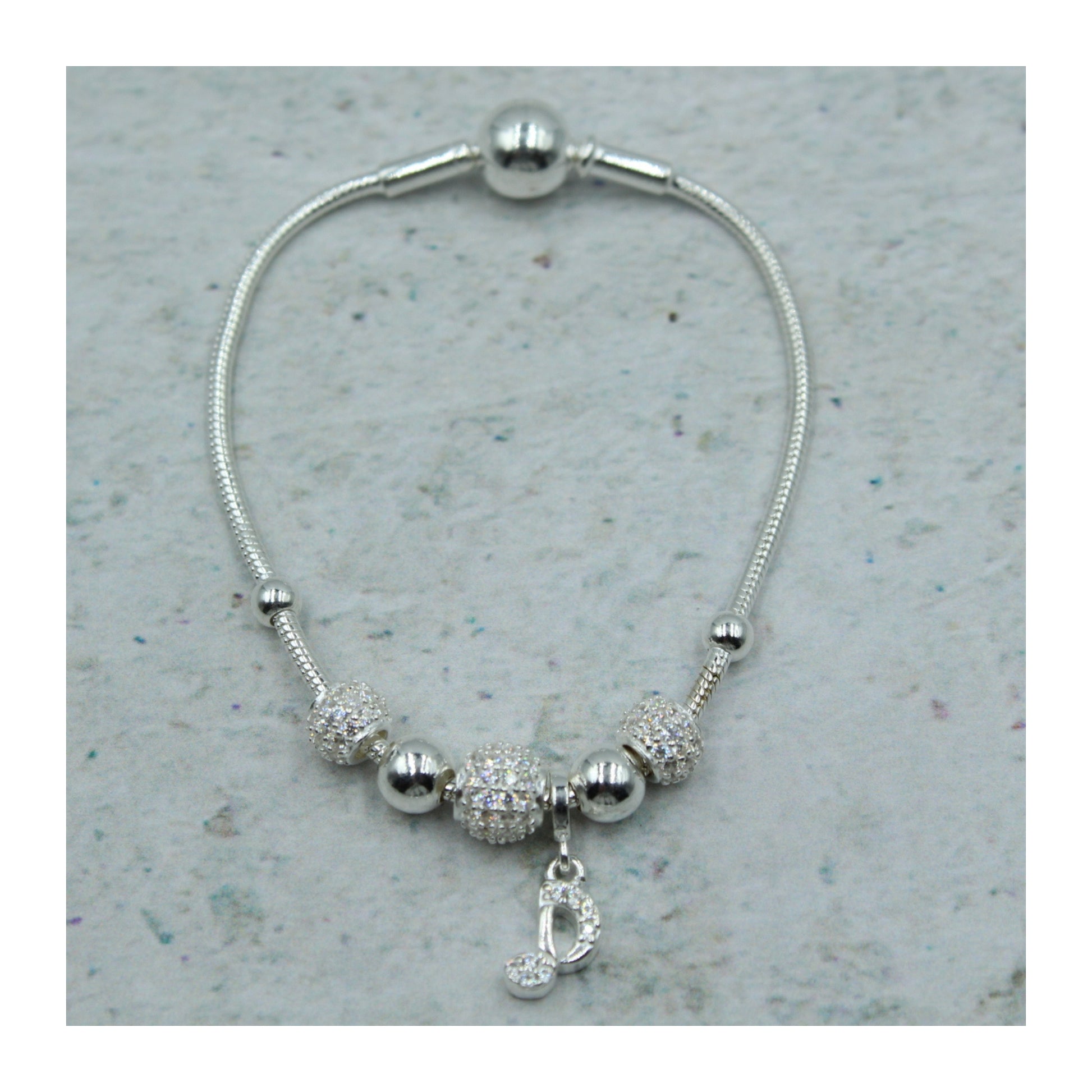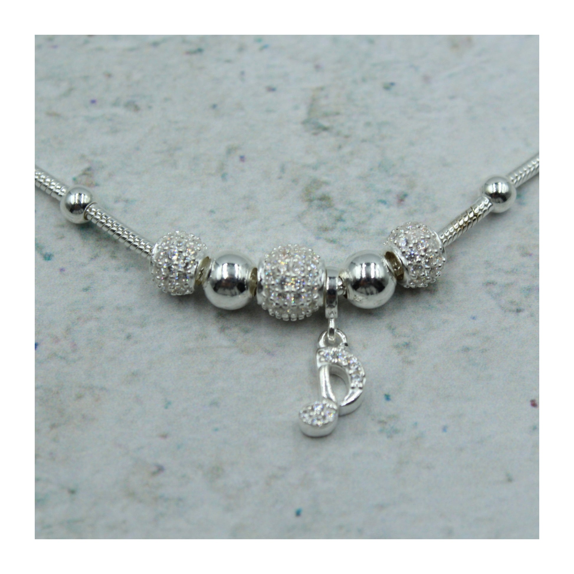 Destaca por su dije en forma de nota musical incrustada con circonias brillantes, símbolo de inspiración y pasión artística. La acompañan tres bolas grandes con circonia y cuatro cuentas lisas en plata que equilibran el diseño con un estilo sofisticado. Su acabado espejo realza la luminosidad de la plata, convirtiéndola en una joya especial para quienes aman la música y la elegancia.